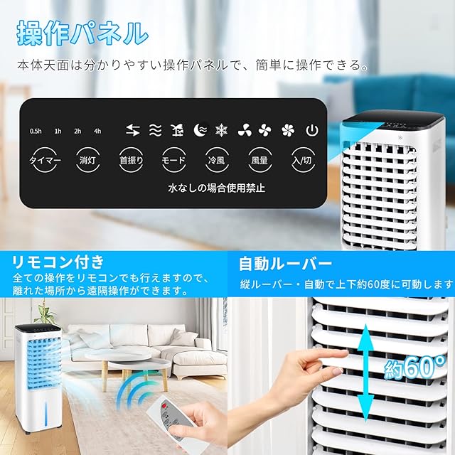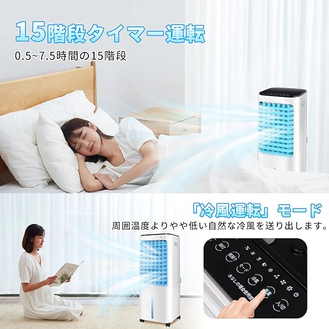 『自動首振り可能・タイマー搭載・静音運転』冷風機 は上下ルーバーを手動120°まで風向調節可能、更に左右ルーバーも付いており、スイッチを入れると風を自動的に左右120°に振ってくれて、冷風扇風機は便利な0.5〜7.5時間切タイマー付きで切タイマー付きで、寝入るまでの間だけ使いたいときや、外出ときに便利!設定した時刻に自動でオン・オフするタイプで、経過時間を指定して自動オン・オフができ、効率的な運転が可能です。特に就寝時に睡眠モードと併用すると、涼しい心地よく寝られながら電気代も低くなります。約45dBの動作音は睡眠や読書、仕事にお邪魔にならなくて、就寝時などに安心に利用できるスポットクーラーです。ご注意:動作音は風量の強弱によって違う場合もございますので、ご了承ください。
