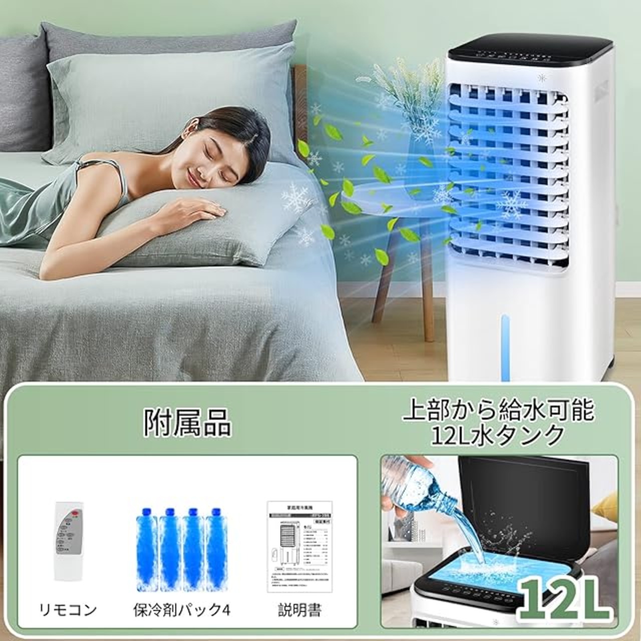 『12L大容量タンク・上部から給水・水不足提示・排水ホース不要』冷風扇風機 は革新的に上部と下部二つの水タンクを搭載しております。上部から給水できて、12L大容量の下部タックがあるため、暑い天気には頻繁的にタンクに水を入れる必要がなく、平均蒸発水量は約0.6L / h(環境の変化、環境の変化)、約20時間まで連続的に冷たい空気と湿気を拡散することができます。日常の使用中、タンク内は水切れの場合、ディスプレイ画面は赤「水滴アイコン」が点滅していて、「ビッビ」と提示音が聞こえて、給水を提示します。注意:水量が不足すると、水が吸えなくなります。水をいっぱい入れてから使ってください。