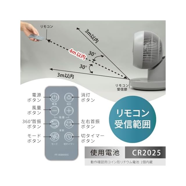 ◆風速:約390m/分 ※風力 8(最大)稼働時(50Hz/60Hz) ◆風量:約15.2m3/分 ※風力 8(最大)稼働時(50Hz/60Hz) ◆風量調節:8段階 ◆首振:360°自動首振/左右自動首振 ◆付属品:リモコン(動作確認用コイン形リチウム電池CR2025×1個内蔵)、保証書付取扱説明書