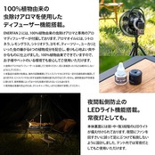 【100%植物由来の虫除けアロマディフューザー機能搭載】アロマオイルには、シトロネラ、レモングラス、シトリオドラ、ヨモギ、ティーツリー、ユーカリといった虫の嫌がる6つの植物成分を配合し、香りも心地よい爽やかなものに仕上げました。人体に優しい100%植物由来で製造していますので、お子様のいる環境でも安心してご使用いただけます。