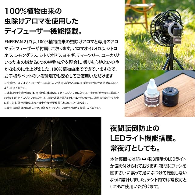 【LEDライト機能搭載】本体裏面には弱・中・強3段階のLEDライトが備え付けられております。夜間にファンを回すさいに誤って足にぶつけて転倒しないように設計しました。テント内では常夜灯としてもご使用いただけます。