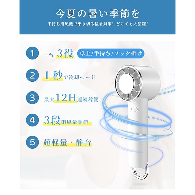 【超軽量&ポータブルな手持ち扇風機】手のひらサイズで約144gの超軽量なので、持ち運びが簡単です。底部にカラビナフックが付いているので、テーブルの上にスタンドとして置くことも、バッグに引っ掛けて持ち歩くこともできます。自宅、会社、車内、通勤、通学、お買い物、散歩、花火大会、お祭り、野外フェス、イベント、スポーツ観戦、キャンプ、旅行、アウトドアなどなどあらゆるシーンで大活躍。