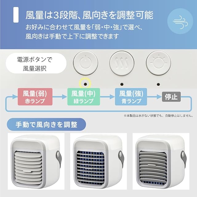 【 特 長 】 ◆デスクなどで手軽に使えるパーソナルクーラー(冷風扇) ◆送風時に水タンクに水を入れると、冷風になります ◆水タンクに砕いた氷を入れて氷水にすると、より冷たい風になります ◆風量は「弱・中・強」の3段階から選べます ◆LEDライト機能搭載 ◆USB給電式 ◆本体カラーはホワイト