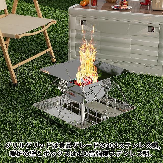 【製品のメリット】頑丈な構造、耐熱性、滑り止め、お手入れが簡単、バーベキュー、キャンプファイヤー、暖炉の3つの用途に使用できます。組み立てと展開が簡単。 ステンレス製の収納ボックスは、広げると炭の灰入れや遮熱板として使用できます