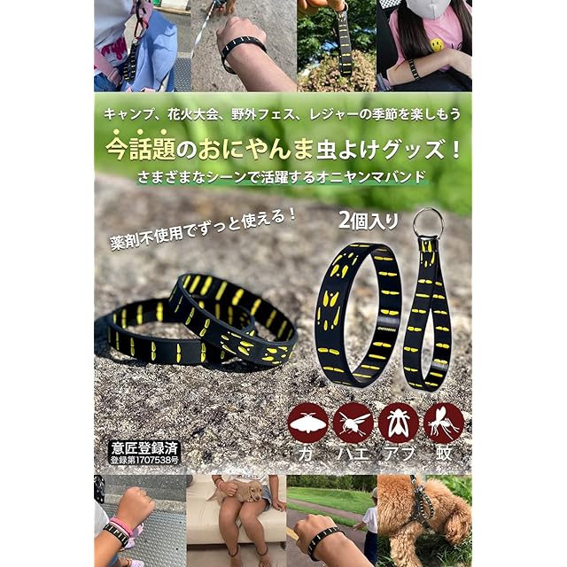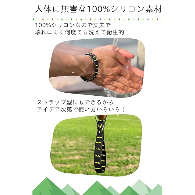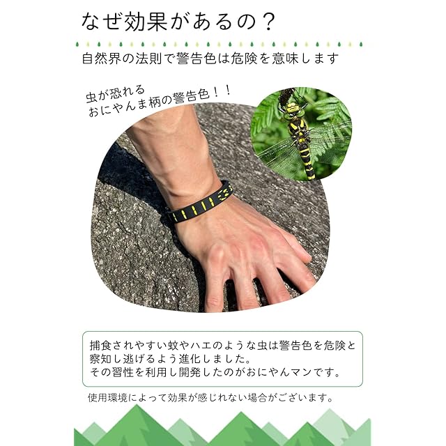 【使用方法】●海水浴、川遊び、登山、公園、釣り、キャ ンプ、ペットのお散歩など様々な場面でご使用いただけます。●手足やリュックなど虫から見えやすい場所につけてご使用ください。※夜は視認性が悪くなるため効果が感じれない場合がございます。