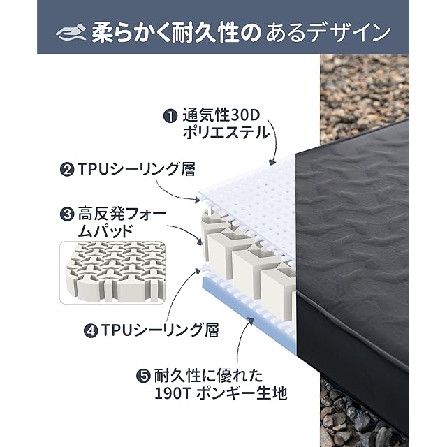【快適な耐磨耗素材】エアーマットレスのカバー生地と側壁は、最新の30D伸縮性ファブリック生地にTPUコーティングを施し、ソフトで音が小さい、防水、耐磨耗、耐引裂性、耐久性に優れています。 裏生地は高温耐摩耗性、軽量190Tポンジ生地を使用し、裏生地に滑り止め粒子を加え、滑り止め性を向上させています