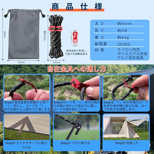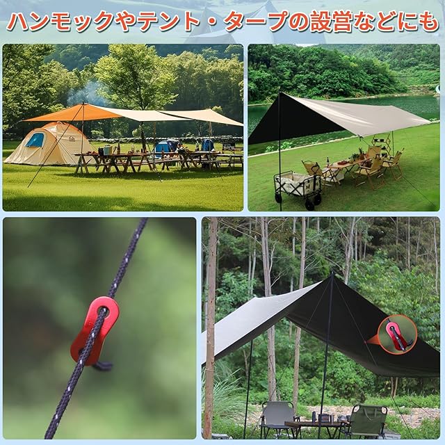 【軽量で多用途】テントロープは軽量でコンパクトに収納でき、持ち運びが楽です、キャンプ、登山、ハイキング、狩猟など、キャンプ以外にも、庭のシェード固定や災害時の応急対応、荷物の固定など、多用途に使用可能。アウトドアはもちろん、日常生活や緊急時にも役立ちます。