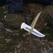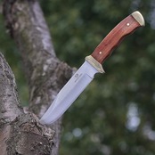 【特徴】シースナイフのブレードを挟み込んだ堅牢なフルタング構造で、サイズの割りに重量バランスはニュートラルなので、握りやすく、力を入れやすいです。グリップ材質は天然ウッド材で手に優しくて、高級感があります。