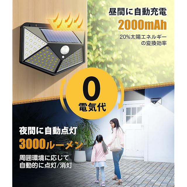 【電気代高騰に対策! 注目を浴びる太陽光発電】エネルギー価格の高騰傾向はここ数年続いており、電気代の負担増の懸念を念頭に、Asheiの人感センサーライトでは、太陽光発電や蓄電池を導入することで電気代ゼロ、CO2排出ゼロ、環境に優しいECO照明を実現!!蓄電効率の高いソーラーパネルの採用で、約5~6時間で満充電になり、点灯時間は(強)で約6h、Low(弱)約12h持続します。さらに、地震・津波・台風・落雷等の自然災害による緊急停電なら、照明機能を保ち、災害時の非常用ライトとしては最適です。