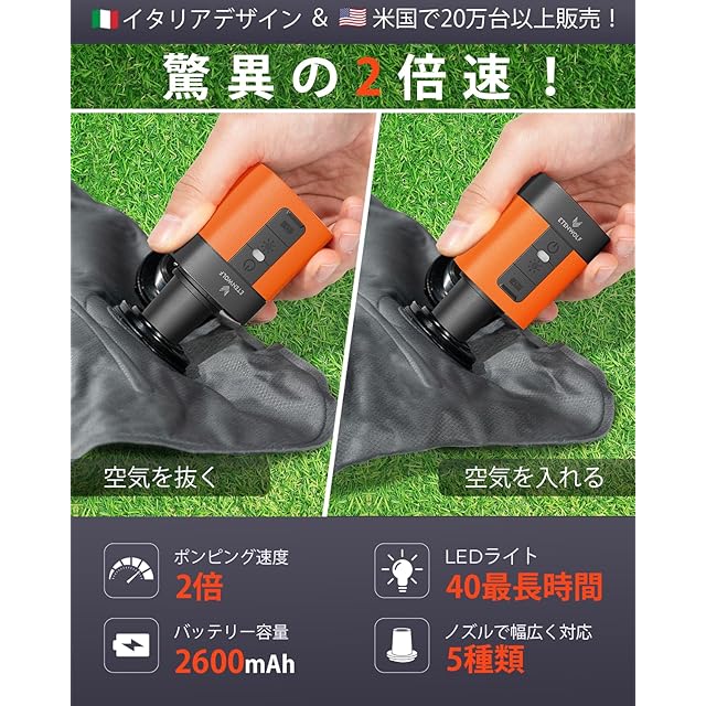 5つのノズル&多用途:5つのノズルが付属しており、AIR 3エアーポンプ キャンプ、エアマット、インフレーターマット、キャンプマット、プールフロート、スリーピングパッド、スイミングリング、インフレータブル家具、その他のインフレータブルキャンプ用品やおもちゃなど、ほとんどのインフレータブル製品に対応しています。