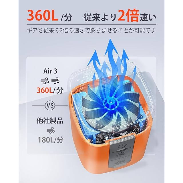 2倍速いインフレート&デフレート:4.5 kPa(0.65 PSI)の空気圧と13 CFM(360 L/min)の風速により、ETENWOLF AIR 3 電動エアポンプは迅速な膨張または排気を実現します。エアマットレスをわずか1分で膨らませ、40秒で排気できます。