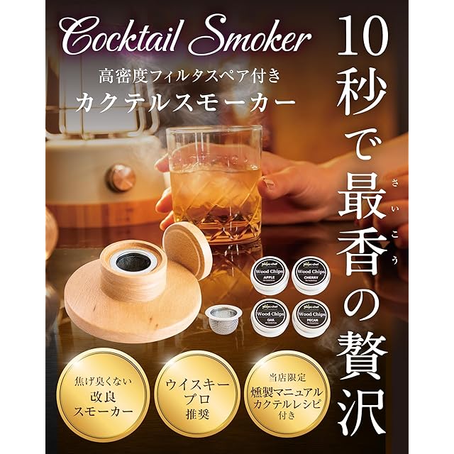 お酒をスモークして香りや風味を楽しむ事が出来るアイテムになります。 従来品は燻製を重ねる毎に焦げが発生し、臭い、味に渋みが出る、見た目が真っ黒など問題が発生しておりました。 今回改良設計を行い、底が無く焦げにくい、煙が出やすい構造に改良致しました。 多様な利用が可能な当商品は、お酒だけでなく、食べ物も燻製できます。 好みのスモークで自由自在に楽しむことができます。さまざまなブレンドや味変を楽しんで、独自の体験をお楽しみください。 使い勝手の良さと多彩なバリエーションが、本格的な愛好家から初心者まで幅広いニーズに応えます。 本体は燻製チップを入れる台座と煙を閉じ込める蓋のみなので、構造はかなりシンプルです。素材はウイスキー樽にも使われるオーク材が使われています。 トーチで燃焼させることで、煙が発生し、お酒に香りや風味を追加することができます。 使用するお酒の種類に制限はありませんが、様々なお酒、また、ナッツやキューブチーズなども簡易的にサッと燻製ができます。