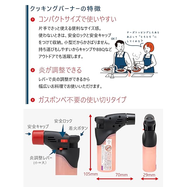 安全キャップや安全ロック付きで安心して使用できる。炎の調整も可能