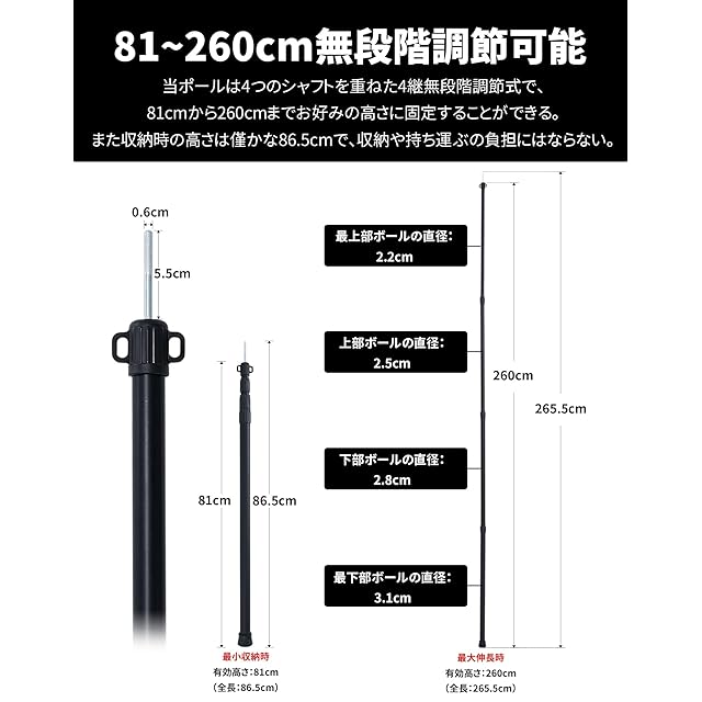 【無段階伸縮式テントポール】テントポールは4つのシャフトを重ねた4継無断階調節式を採用し、スライドさせ、回して固定するだけで、高さは無段階で81cm~260cmに調節できます。手軽に長さを変えられるので設営後の高さ変更もラクにできます!