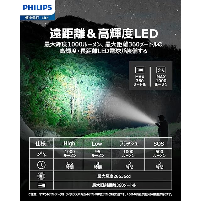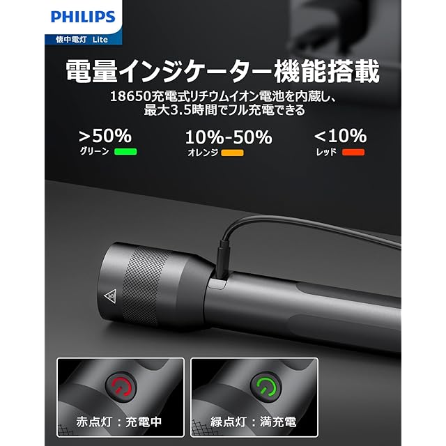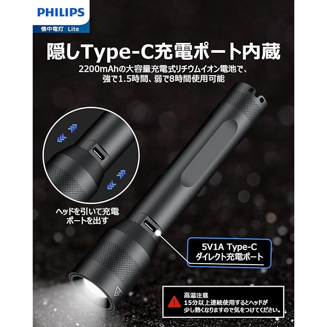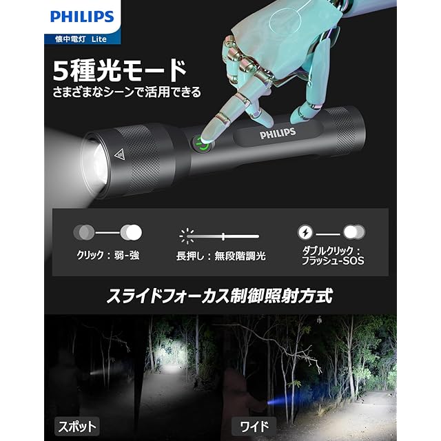 Philips(フィリップス)【超小型ledライト】強力 懐中電灯 高輝度 1000ルーメン フラッシュType-C充電式 ハンディ【ズーム調節/5つ調光モード/低電量提示/携帯便利】軽量18650電池付属 キャンプ/防災/停電対策 SFL3601