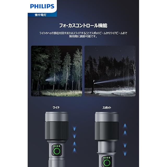 Philips(フィリップス) 懐中電灯 小型 led ライト 高輝度1450ルーメン 600メートル 5つ調光モード フォーカスコントロール ハンディライト Type-C充電式 IP55防水 大容量電池 アルミ合金製 耐衝撃 アウトドア 防災 停電対策 夜間散歩 携帯便利 SFL2101