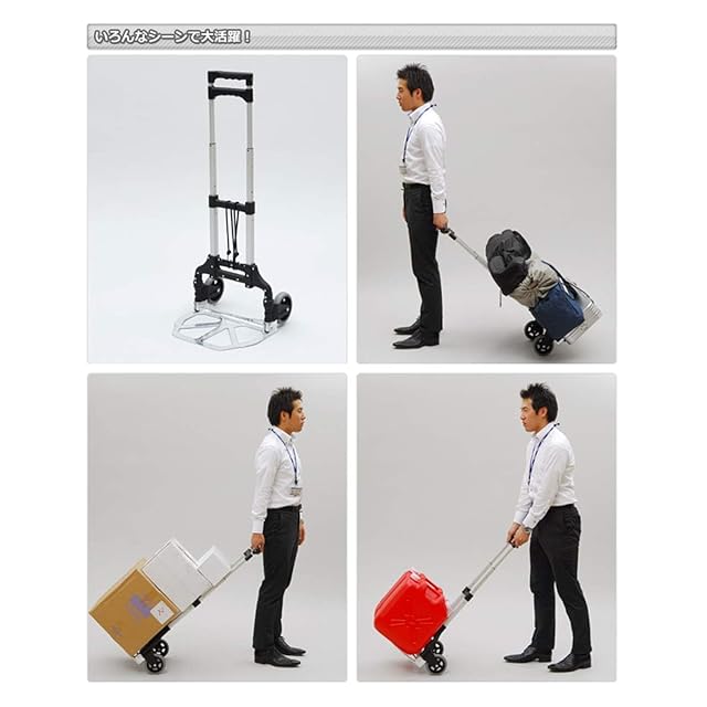 ●荷物運びをスムーズに!積載荷重50kgの丈夫なキャリーカート。●荷台を広げるとタイヤが自動的に飛び出します。●大きい荷台で荷物が安定。●丈夫で軽量なアルミフレーム採用。