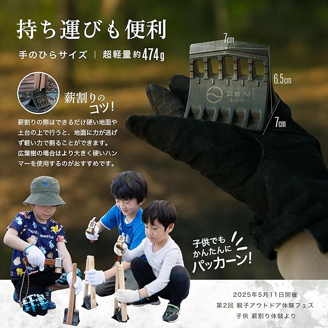 【薪割りの悩みを解決】 焚き火には欠かせない薪。購入した薪は太さがバラバラでそのままだと使い難く薪割りが必要不可欠ですが、ナイフでのバトニングや斧を使った薪割りは安定性も悪く怪我のリスクもあり、何本もやるのは時間も掛かって大変です。 刃冠は安定性と割れやすさに特化した置き型のくさびになっているため安定性もあり、上からハンマーで叩くだけで子供や女性でも簡単に薪割りができます。苦労する薪割りも楔を使用すると簡単に楽しく。気づいたら没頭しています。