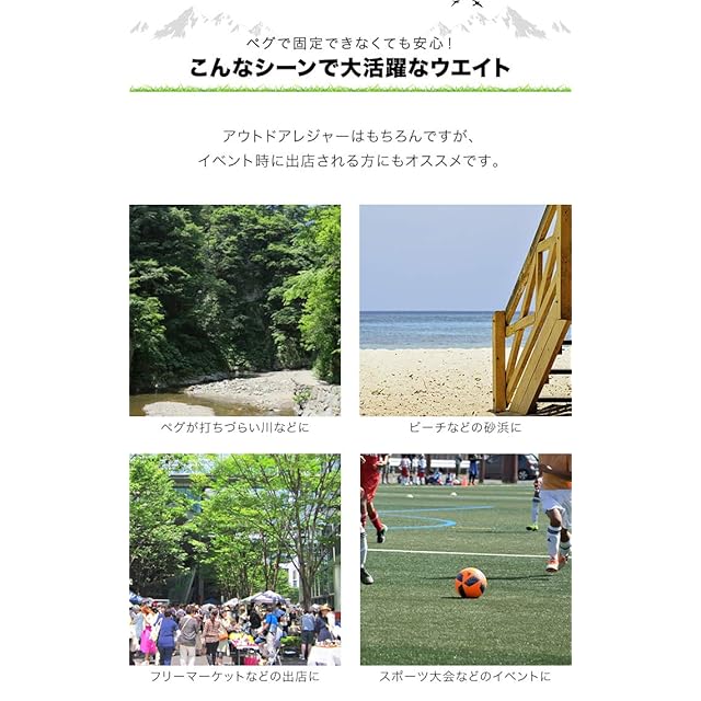 【タープテントをしっかり支えるウエイト】 ペグが使用できない場所に便利なウエイトです。2つの錘でしっかり固定することができます。アスファルトやビーチでタープテントを設営する時に、大活躍間違いなしのアイテムです。