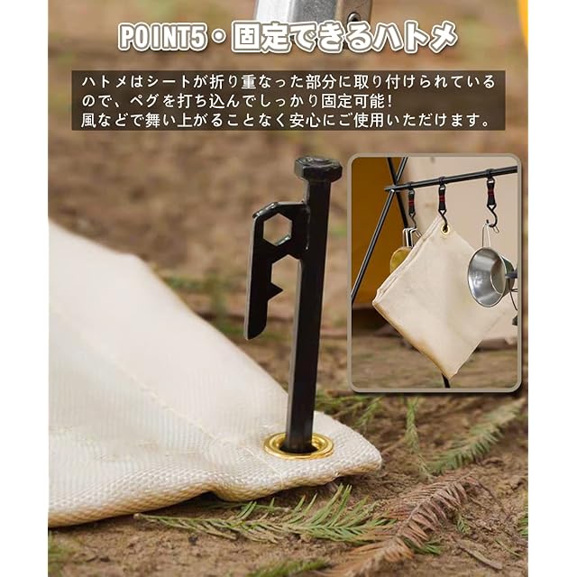 【丈夫で便利なハトメ】シートが折り重なった四隅にハトメをしっかりとカシメた頑丈な設計となっており、ハトメが外れる心配はありません。強風の日でも、ペグを使って焚き火台シートを地面に固定することで、風などによる舞い上がりを防ぎ、安全にご使用いただけます。(ペグは別売りです。)