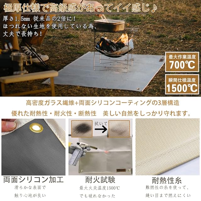 【高耐熱焚き火シート】高密度ガラス繊維+両面シリコンコーティングにより3層構造で耐火性はより高く、作業の耐熱温度は700℃で、瞬間使用温度1500℃です。縫製に使用する糸までも難燃性があり、縫い目もしっかりほつれにくいから、繰り返しご利用いただけます。
