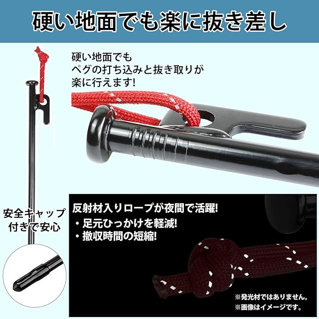 ◆打ちやすいヘッドデザインでハンマーからの打撃を確実にボディに伝えガンガン刺さります。◆反射材入りロープ付の為夜中の撤収時、ペグの位置がわかり簡単に回収出来ます。忘れ防止の目印、つまずき防止に役立ちます。