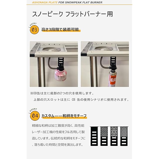 【スノーピーク フラットバーナー用】アシナガプレートは器具栓ホルダーをロングサイズすることで器具栓の着脱を容易にし、ツマミや点火スイッチの操作性を向上させるためのアイテムです!純正の器具栓プレートは高さが低くツマミの調整がやりづらいです。器具栓プレートを長くし、調整段階を増やすことで、ノブや点火スイッチの操作性が向上しました