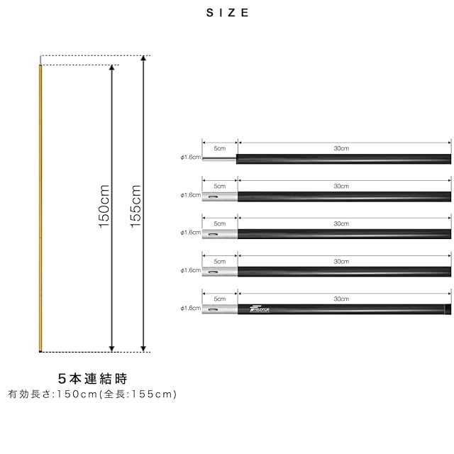 ✅【商品詳細】 サイズ 5本連結時 : (約)φ1.6cm×155cm (有効長 : 150cm) 収納サイズ : (約)11cm×37cm 材質 A7075 超々ジュラルミン 重量 5本連結時 : (約)250g (1セットあたり) セット内容 こちらの商品にはペグ・ロープは付属いたしません。