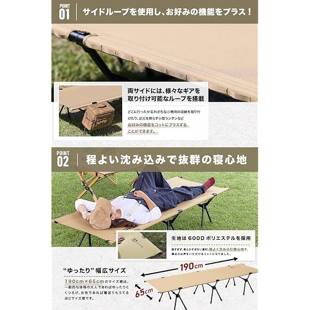 ✅【日本国内の耐荷重検査合格済み製品】コット全体で支える安心の耐荷重スペック”150kg”アルミ素材の中でも特に強度の高い”A7075(超々ジュラルミン)”を採用することにより 小さな子どもから大人まで安心して御使用頂けるスペックに仕上がりました。✅【ハイ・ローどちらでも使用可能】付属のレッグポールを抜き差しすることで、コットをハイスタイル・ロースタイルの 2つの高さに調節することが可能です。お好みの高さ、テントの大きさに合わせたスタイルでお楽しみください