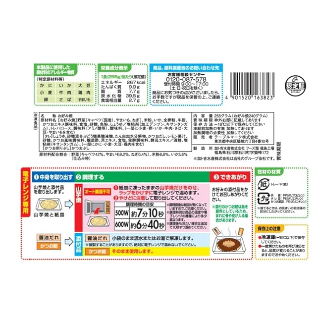 原材料: 【お好み焼】野菜〔キャベツ(国産)、やまいも、ねぎ〕、米粉、いか、全卵粉 、牛脂、かつおエキス調味料、食塩、砂糖、魚粉、しょうゆ/増粘剤(加工デン プン、キサンタンガム)、トレハロース、調味料(アミノ酸等)、酸味料、(一 部に小麦・卵・いか・牛肉・さば・大豆・やまいもを含む) 【タレ】しょうゆ、砂糖混合ぶどう糖果糖液糖、たん白加水分解物、かつおだし 、レモン果汁、砂糖、かつお風味調味料、醸造酢、貝エキス、食塩、発酵調味料 、酵母エキス/酒精、増粘剤(キサンタンガム)、(一部にかに・小麦・大豆・ 鶏肉を含む) 【かつお削りぶし】かつおぶし
