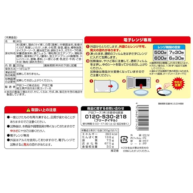 栄養成分: 1包装当たり エネルギー:393Kcal たんぱく質:13.8g 脂質:7.5g 炭水化物:67.5g 食塩相当量:3g