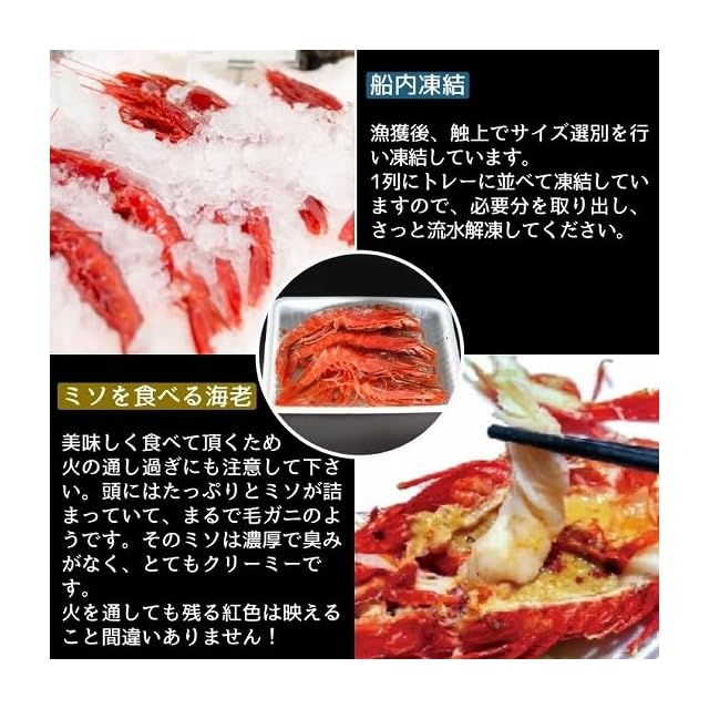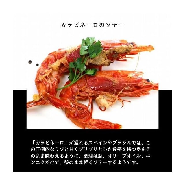 甘味のある身、濃厚な海老味噌。カラビネーロです。 </br>深海に生息しているため養殖は難しく、世界各地で生息していますが漁獲が少なく、大変希少な海老となります。</br>引き締まった甘味のある身はもちろん美味しいのですが、この海老の最大の特徴は、海老味噌”となります。 </br>サイズからは想像できない量の味噌を抱えています。</br>臭みは無く、クリーミーな味は他の海老とは異なり絶品です。</br>また、殻は全体的に柔らかいので、ハサミや包丁が簡単に入り、手剥きも容易に行えます。</br>更に火を通しても残る紅色は映えること間違いありません。</br>1列にトレーに並べて凍結していますので、必要分を取り出し、さっと流水解凍してください。(半解凍が調理しやすいかと思います)自然解凍や長時間の流水解凍は鮮度落ちや退色の原因となりますのでなるべく避けて下さい。 </br>加熱用。また、美味しく食べて頂くため火の通し過ぎにも注意して下さい。