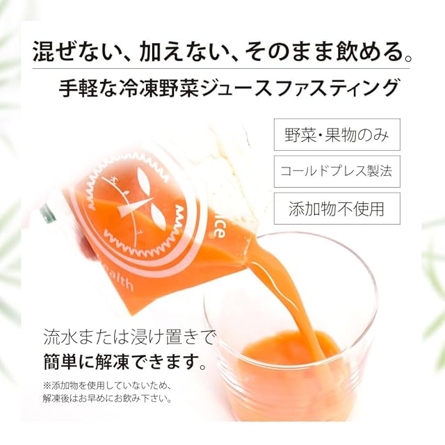 【商品特徴】ファスティングにぴったりの飽きることないワンデイクレンズジュースのセットはニンジンジュースをメインとした7種類の健康ジュースの詰め合わせです。生搾りの野菜ジュースをすぐに冷凍するから新鮮さを感じます。保存料不使用の濃縮還元ではない ストレートジュースです。