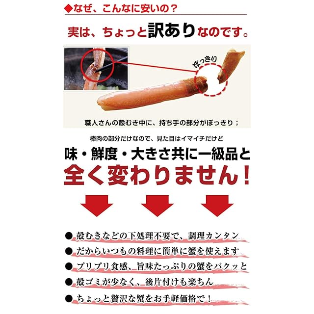 訳ありのずわいがに脚をたっぷり1㎏お届けします。訳ありとは加工途中でどうしても折れてしまう脚のことです。品質・味は正規品と変わりありません。