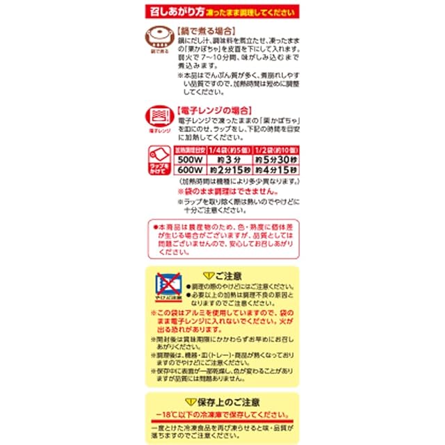 甘みが強く、薄皮でホクホクの食感が特徴の栗かぼちゃです。中国(黒竜江省)産の高品質なかぼちゃです。原料栽培〜加工まで全て、工場管理下で行われるため、一貫した熟度管理が可能となり、食感や甘みが安定した製品に仕上がっています。品種は、日本品種系の「ほっこり種」に限定しており、同種はでんぷん価が高いため、ホクホクの食感が特徴です。また、工場では手で丁寧に一口カットし、均一なサイズに取り揃っています。なお、同品は一般消費者のニーズに応えた、大袋(もりもりパックシリーズ)での展開あり、5ADAY=一日350g以上の野菜摂取を促進する運動とかけ合わせたシリーズ商品となります。