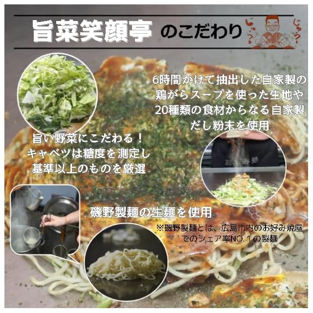 【旨菜笑顔亭】 2015年(平成27年)広島県三原市から東京都調布市仙川に上京。 『みっちゃん仙川本店』の屋号にて、広島お好み焼店の営業をスタート。 【製造者】 〒182-0001 東京都調布市緑ヶ丘1?10?19 みっちゃん仙川本店