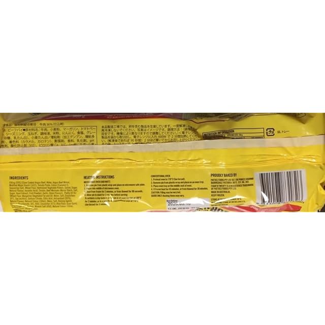 本場オーストラリアの「ミートパイ」。こちらは12個セットとなります。 レンジやオーブンで簡単調理するだけでホームパーティーや間食、またはランチなどに手軽に食べられるようになっています。 2019年に上陸したばかりの本商品ですが、本国オーストラリアでは60年以上も愛されているパイです サクサククリスピーなパイが、とろっとろのアンガスビーフを包んでおります。日本ではまだあまり馴染みはありませんが、オーストラリアではラグビー観戦などのお供として愛されています。 冷凍のままのパイ1個を電子レンジ(600W)で2分加熱 オーブントースターで表面がサクっとするまで再加熱するとより美味しくお召し上がりいただけます