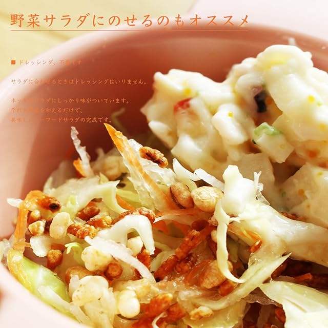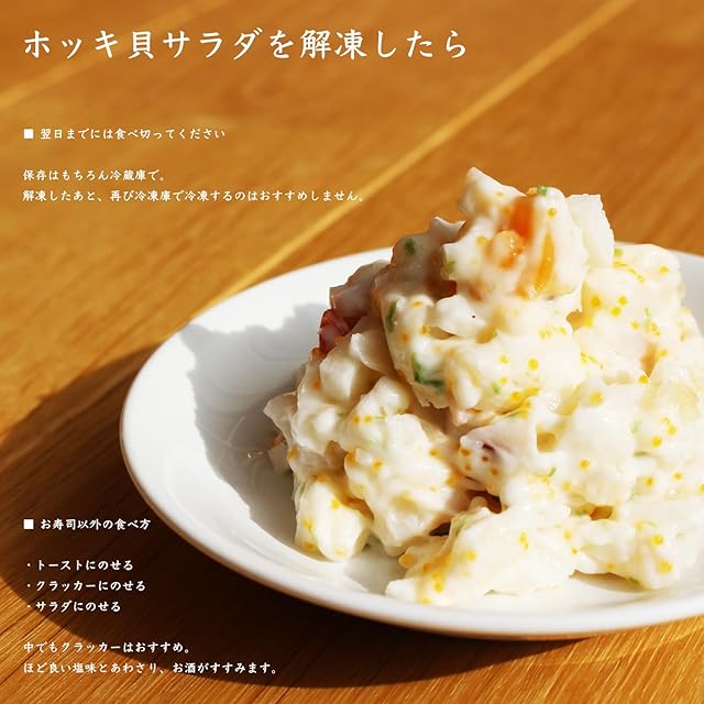 カナダホッキ貝入りの海鮮サラダになります。回転寿司でおなじみの商品です。軍艦や手巻き寿司、クラッカーの上に乗せて食べたりといろんな楽しみ方ができます。あなた好みのいろんなアレンジでお召し上がりください。