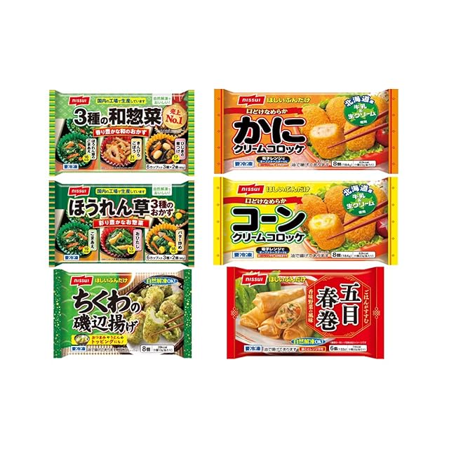 ●口どけなめらか コーンクリームコロッケ 栄養成分表示(1個23g当たり)、エネルギー62kcal、たんぱく質1.2g、脂質3.6g、炭水化物6.1g、食塩相当量0.2g※サンプル品分析による推定値●ちくわの磯辺揚げ 栄養成分表示(1個13g当たり)エネルギー28kcal、たんぱく質1.0g、脂質1.1g、炭水化物3.7g、食塩相当量0.2g※サンプル品分析による推定値●五目春巻 栄養成分表示(1個22g当たり)エネルギー74kcal、たんぱく質1.4g、脂質4.8g、炭水化物6.5g、食塩相当量0.3g サンプル品分析による推定値