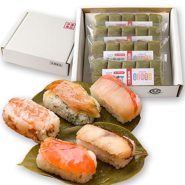 【内容量】柿の葉寿司(焼さば)4個、柿の葉寿司(穴子)4個、柿の葉寿司(炙りさけ)4個、柿の葉寿司(えび)4個、柿の葉寿司(金目鯛)4個