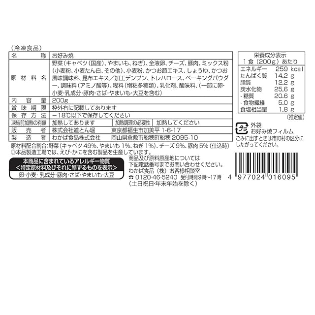 野菜(キャベツ(国産)、やまいも、ねぎ)、全液卵、チーズ、豚肉、ミックス粉(小麦粉、小麦たん白、その他)、小麦粉、かつお節エキス、しょうゆ、かつお風味調味料、昆布エキス/加工デンプン、トレハロース、ベーキングパウダー、調味料(アミノ酸等)、糊料(増粘多糖類)、乳化剤、酸味料、(一部に卵・小麦・乳成分・豚肉・さば・やまいも・大豆を含む)