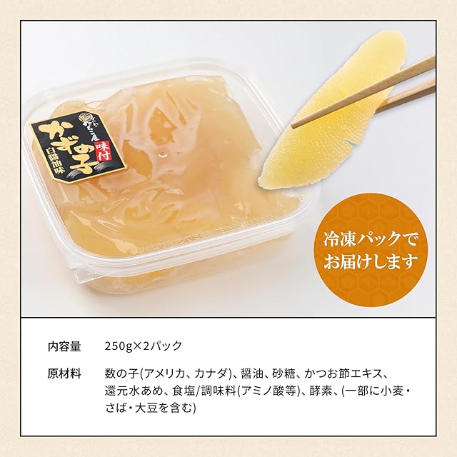 【伝統の味を新しい形でお届け!】老舗の味わいをモダンな冷凍パックでお届けします。数の子の食感を最大限に生かした白醤油ベースの味付けは、昔ながらの上品さを感じさせつつも、どんな料理にも合う使いやすさが魅力です。冷凍で長期保存が可能なので、お好きなときにいつでも解凍して、新鮮な数の子の味を楽しむことができます。ご自宅用はもちろん、ギフトとしても喜ばれること間違いなし。