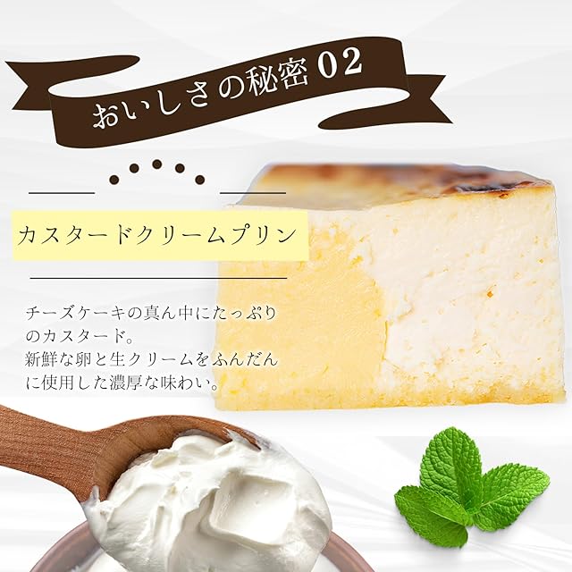 【みんな大好きカスタードクリームプリン】チーズケーキの真ん中にたっぷりのカスタード。 新鮮な卵と生クリームをふんだんに使用した濃厚な味わい。
