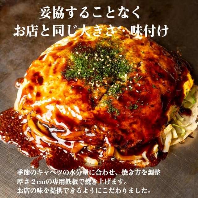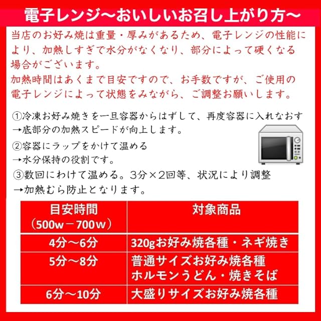 【電子レンジ対応容器付】注意:当店のお好み焼きは重量、厚みがあるため、電子レンジの性能により、加熱しすぎで水分が無くなり、部分的よって硬くなる場合があります。加熱時間はあくまで目安ですので、お手数ですが、ご使用の電子レンジによって状態をみながら、ご調整お願いします。 真空パック後、冷凍して発送します。電子レンジ500W−700W(5分〜8分)分加熱してお召あがりください。ソースは塗っていますので、添付のソースはお好みに合わせてご使用ください。