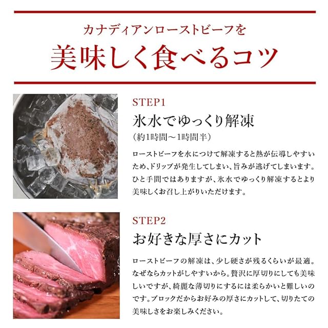 ローストビーフは、さっぱりしていながらもジューシー! モモを使用したローストビーフは、柔らかいながらも食べごたえ抜群でコスパ最高! 自宅での普段使いとしても需要が高く、1〜2人前にちょうどいい量です。 切って盛り付けるだけでレストランで食べるようなプロの仕上がりに。写真映えもOK! 脂身が少ないため、敬老の日・敬老の日などのイベントで出せば素敵なディナーの出来上がり! おウチがレストランに早変わりです!