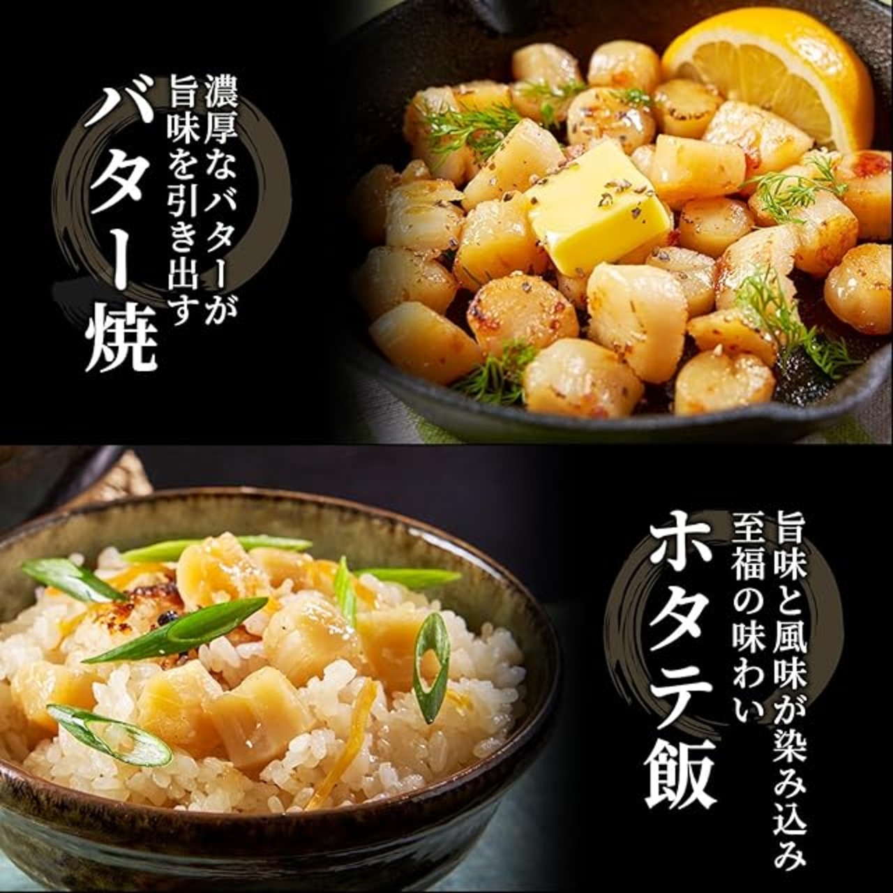 ?一度では食べきれないほどのたっぷり大容量1kgですが、1粒ずつバラバラに凍結しているので小分けにしておけば冷凍庫の隙間にも入れられて、食べたい時に食べたい分だけ取り出せます。 癖のないホタテの旨みは、どんな料理にもよく合うので、時間がないけどもう一品ほしいそんな時にも役立つ万能な食材です。