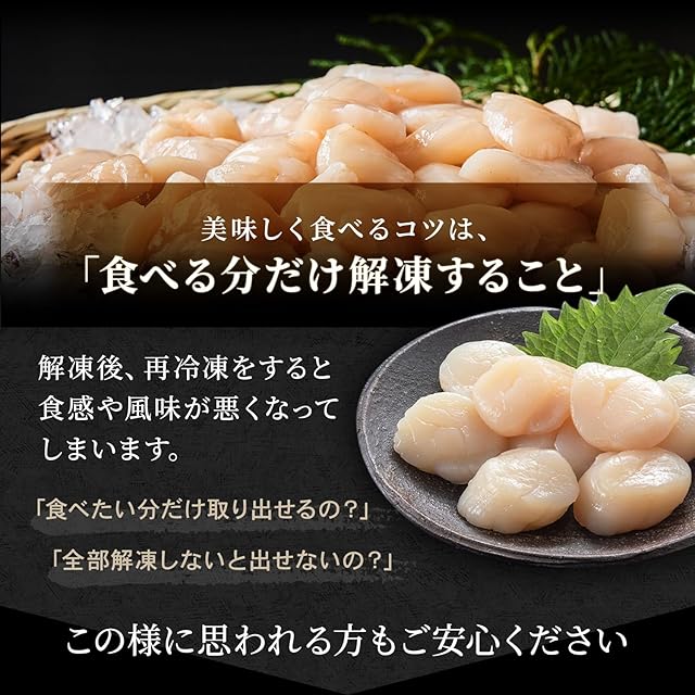 ?本品は正規品の製造過程で出来る「割れ・欠け・サイズ不揃い」等の訳あり規格ですが、味は正規品同様の美味しさです。 お刺身はもちろん、バター焼き、天ぷら、カルパッチョ、海鮮丼などでいろいろな料理で美味しくお召し上がりいただけます。 また、ストックしておいてお弁当のおかずにもお勧めです。