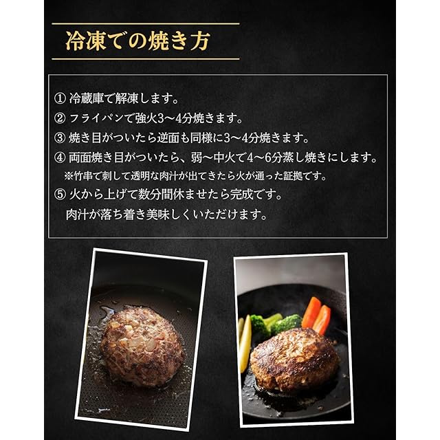 【冷凍での焼き方】① 冷蔵庫で解凍します。② フライパンで強火3?4分焼きます。③ 焼き目がついたら逆面も同様に3?4分焼きます。④ 両面焼き目がついたら、弱?中火で4?6分蒸し焼きにします。 ※竹串で刺して透明な肉汁が出てきたら火が通った証拠です。⑤ 火から上げて数分間休ませたら完成です。肉汁が落ち着き美味しくいただけます。
