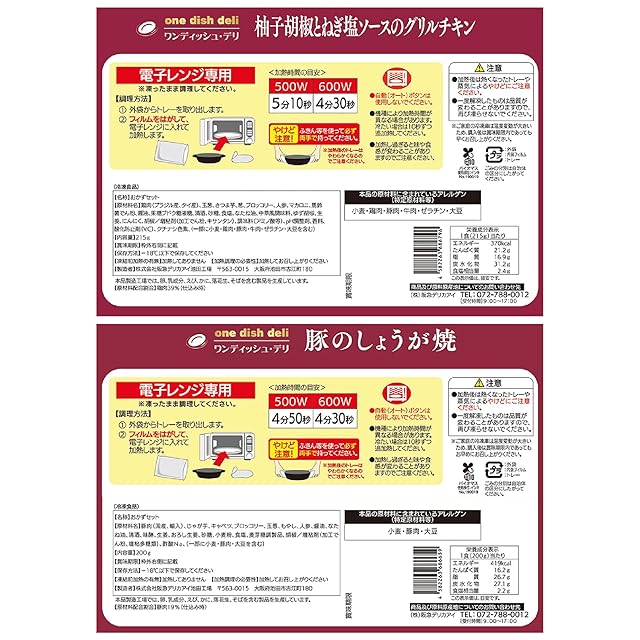 【おろしソースのハンバーグ】熱量:312kcal 食塩相当量:2.9g たんぱく質:12.3g 脂質:15.6g 炭水化物:31.7g【オニオンソースのグリルチキン】熱量:411kcal 食塩相当量:2.3g たんぱく質:22.0g 脂質:15.9g 炭水化物:41.8g【柚子胡椒とねぎ塩ソースのグリルチキン】熱量:370kcal 食塩相当量:2.4g たんぱく質:21.2g 脂質:16.9g 炭水化物:31.2g【豚のしょうが焼】熱量:419kcal 食塩相当量:2.2g たんぱく質:16.2g 脂質:26.7g 炭水化物:27.1g【豚しゃぶのおろしポン酢】熱量:325kcal 食塩相当量:2.5g たんぱく質:15.1g 脂質:18.5g 炭水化物:25.0g 【白身魚と彩り野菜の和風あんかけ】熱量:297kcal 食塩相当量:2.0g たんぱく質:13.6g 脂質:14.3g 炭水化物:27.9g