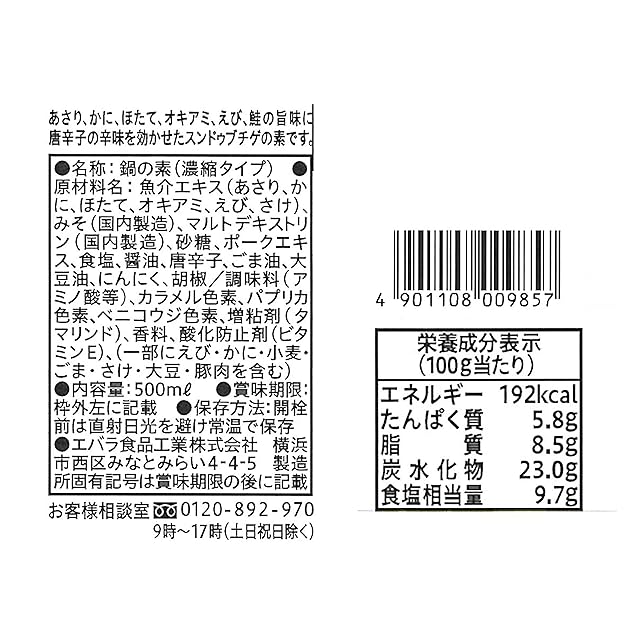 【原材料名】魚介エキス(アサリ、カニ、ホタテ、オキアミ、エビ、サケ)、みそ(国内製造)、豚脂、砂糖、ポークエキス、チキンエキス、食塩、唐辛子、ごま油、醤油、にんにく、胡椒/調味料(アミノ酸等)、増粘剤(キサンタンガム)、パプリカ色素、ベニコウジ色素、香料、酸化防止剤(ビタミンE)、(一部にえび・かに・小麦・ごま・さけ・大豆・鶏肉・豚肉を含む)